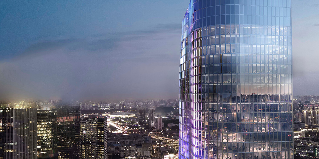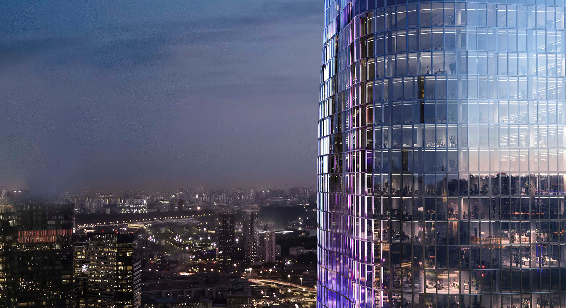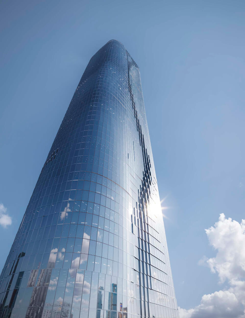 Высота здания — 299 метров, 64 этажа, объединяющих эстетику и инженерную мощь. Фасады выполнены из энергоэффективного остекления с низким уровнем теплопередачи, что создаёт идеальный баланс между естественным светом и защитой от перегрева.