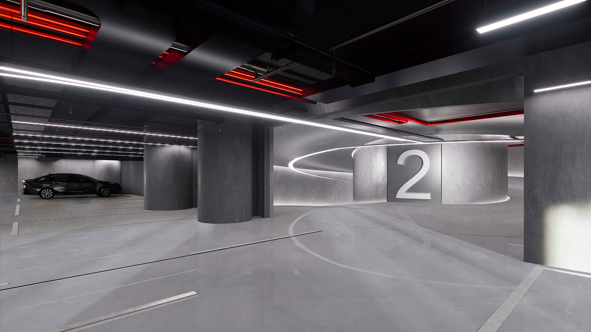 Инфраструктура паркинга интегрирована в общую систему управления зданием. Зимой действует подогрев въездных зон и пешеходных дорожек, обеспечивая безопасность и комфорт.